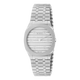 The GUCCI 25H's streamlined silhouette was inspired by the sleek forms of contemporary architecture. The watch is presented with a thin multi-layer case and five-link steel bracelet, while the design is completed by monogram details and a silver sunbrushed dial. The name, GUCCI 25H, is attributed to a particularly symbolic talisman for Creative Director Alessandro Michele.