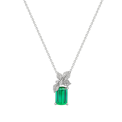 This enchanting necklace centres around an impressive 5.77ct Tourmaline, shaped with a unique stylised step cut to maximise its internal brilliance. The pendant is beautifully integrated with nature-inspired diamond detail, featuring four delicate random pavé diamond leaves interspersed with two shimmering round brilliant Diamond 'berries'. The diamond accents contribute a total diamond weight of 0.30cts.